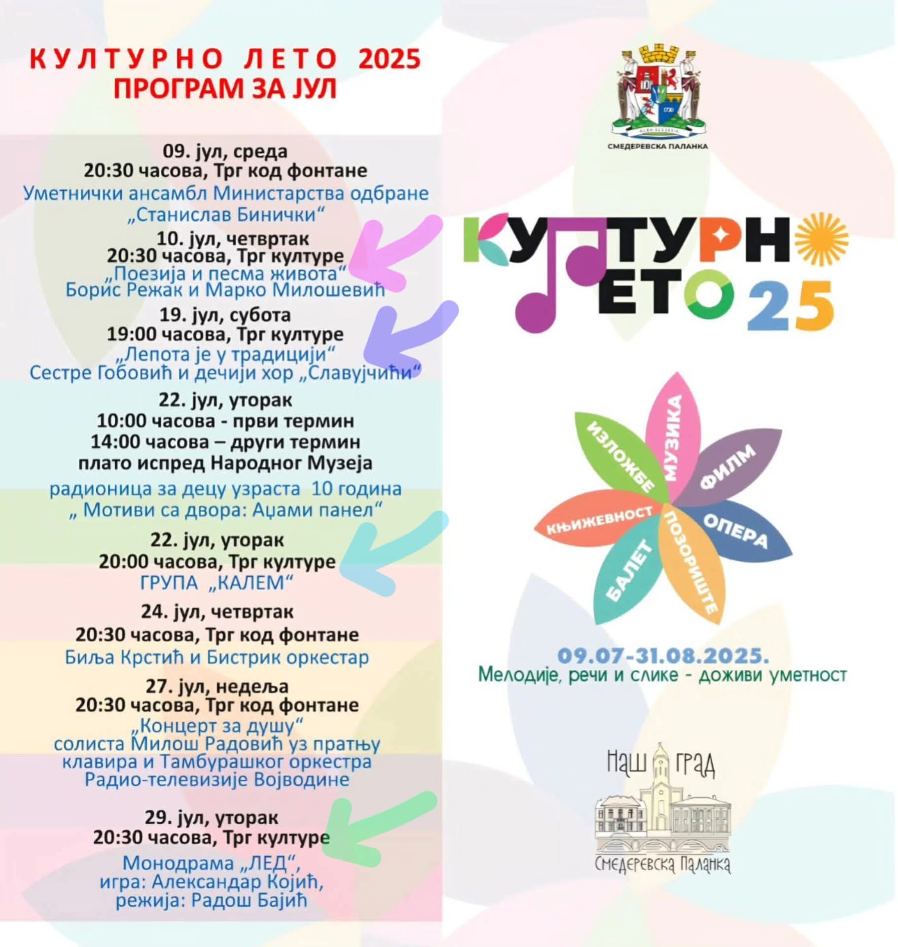 Kulturno leto i ove godine, treći put za redom, tokom jula i avgusta, obogatiće kulturnu ponudu i zabavne sadržaje u Smederevskoj Palanci. Obezbedili smo zanimljiv i kvalitetan program. Pozorišne predstave, koncerte, od klasične preko tradicionalne i etno do popularne i filmske muzike, književne večeri, i poseban program za decu u izvođenju poznatih i renomiranih umetnika. Program će se odvijati na Trgu kod fontane i Trgu kulture kod Biblioteke, od 9. jula do 31. avgusta. Ulaz na sve manifestacije Kulturnog leta i ove godine je slobodan. Vidimo sa na Trgu kod fontane 9. jula.