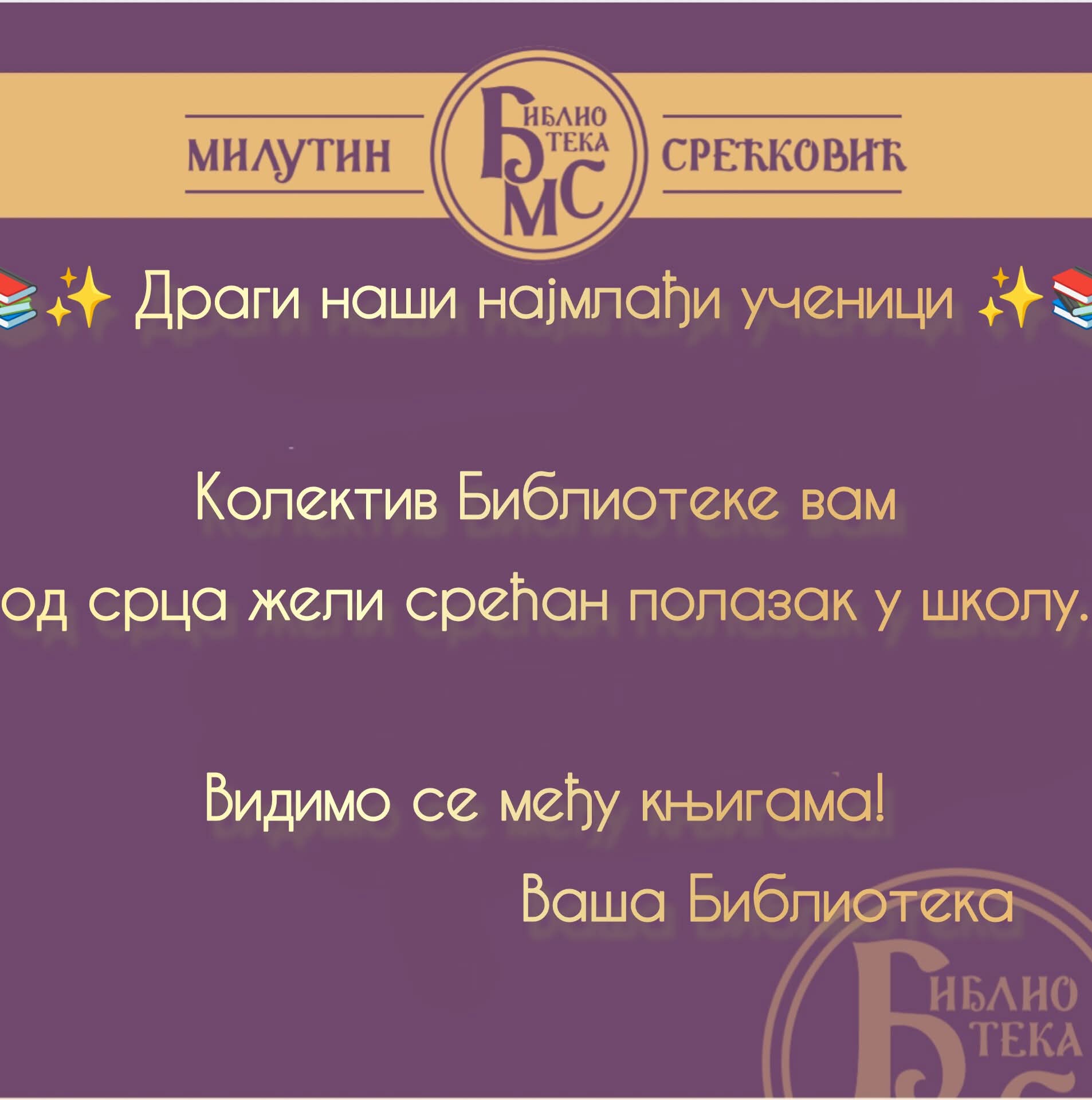 Dragi naši najmlađi, neka vam prvi školski dani budu ispunjeni radošću i osmehom, a svaki korak kroz školske hodnike vodi vas ka novim otkrićima i lepim uspomenama. Biblioteka i ove godine svim đacima prvacima daruje besplatnu člansku kartu. Dobro nam došli.